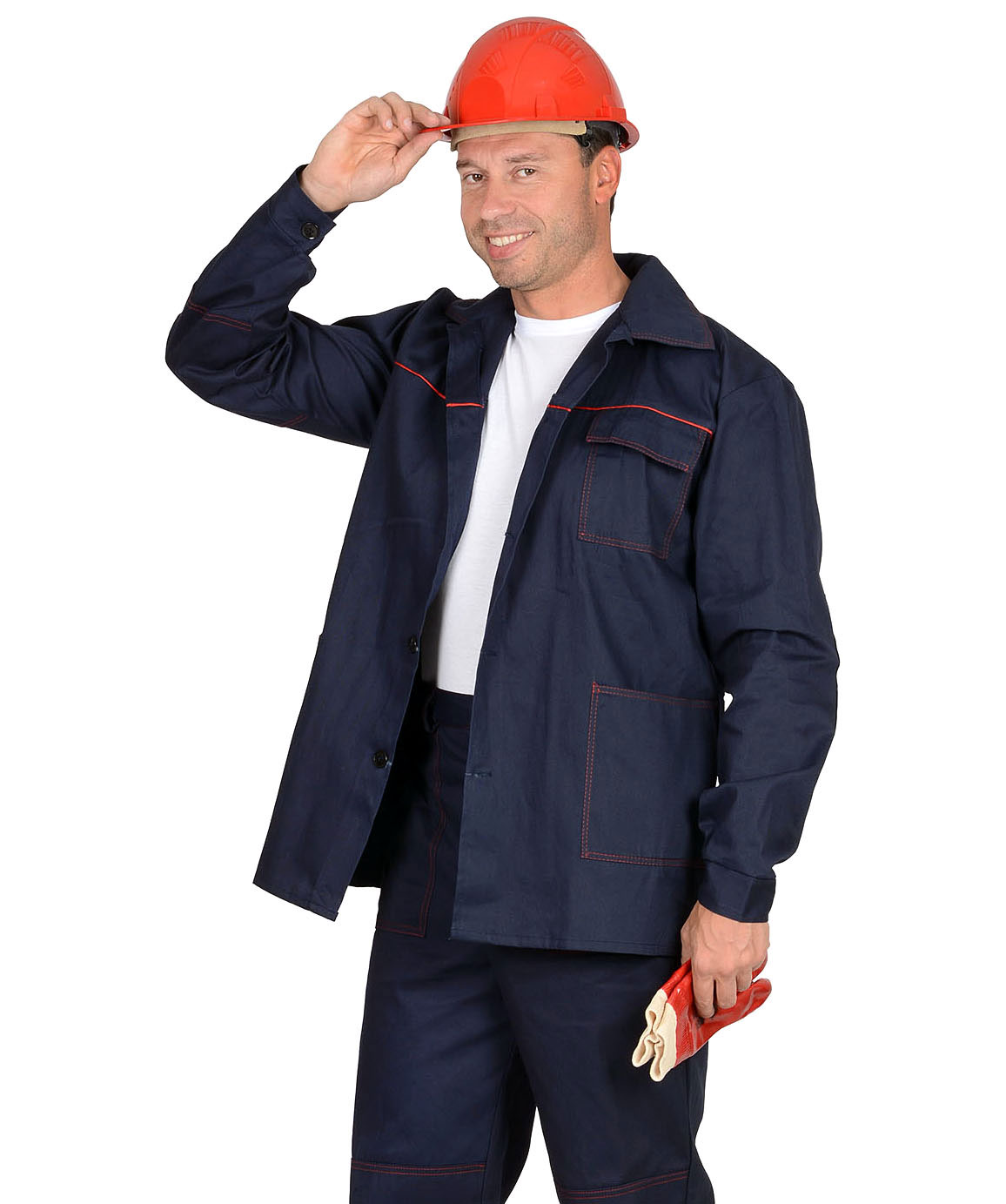 Куртка длинная, прямого силуэта, отложной воротник, с нагрудными и нижними накладными карманами. Манжеты рукавов на пуговице. Куртка и брюки с застёжкой на пуговицы. Брюки прямого покроя с накладными карманами и наколенниками. Кант, отделочные строчки красные. ГОСТ 12.4.280-2014.