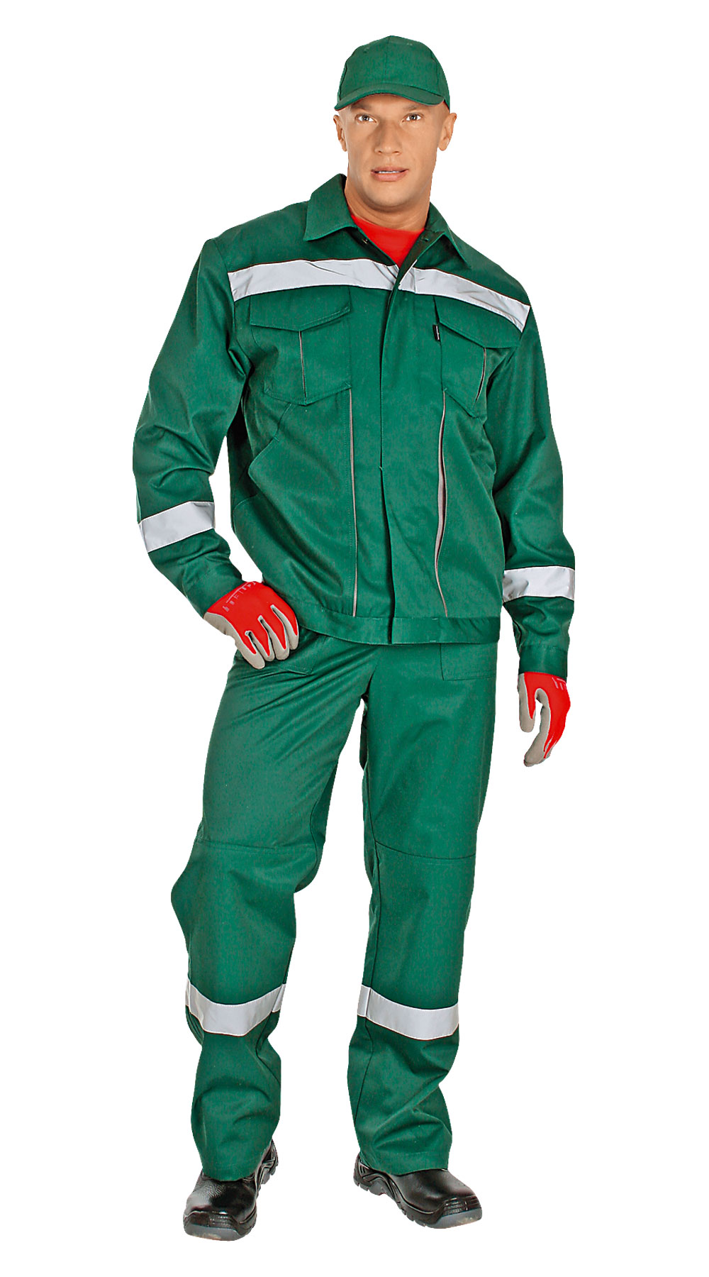 Карманы: накладные нагрудные карманы с клапанами, полуобъемные нижние карманы; на полукомбинезоне — карманы нагрудный и для инструментов Световозвращающие элементы: по груди, спине, рукавам, внизу полукомбинезона